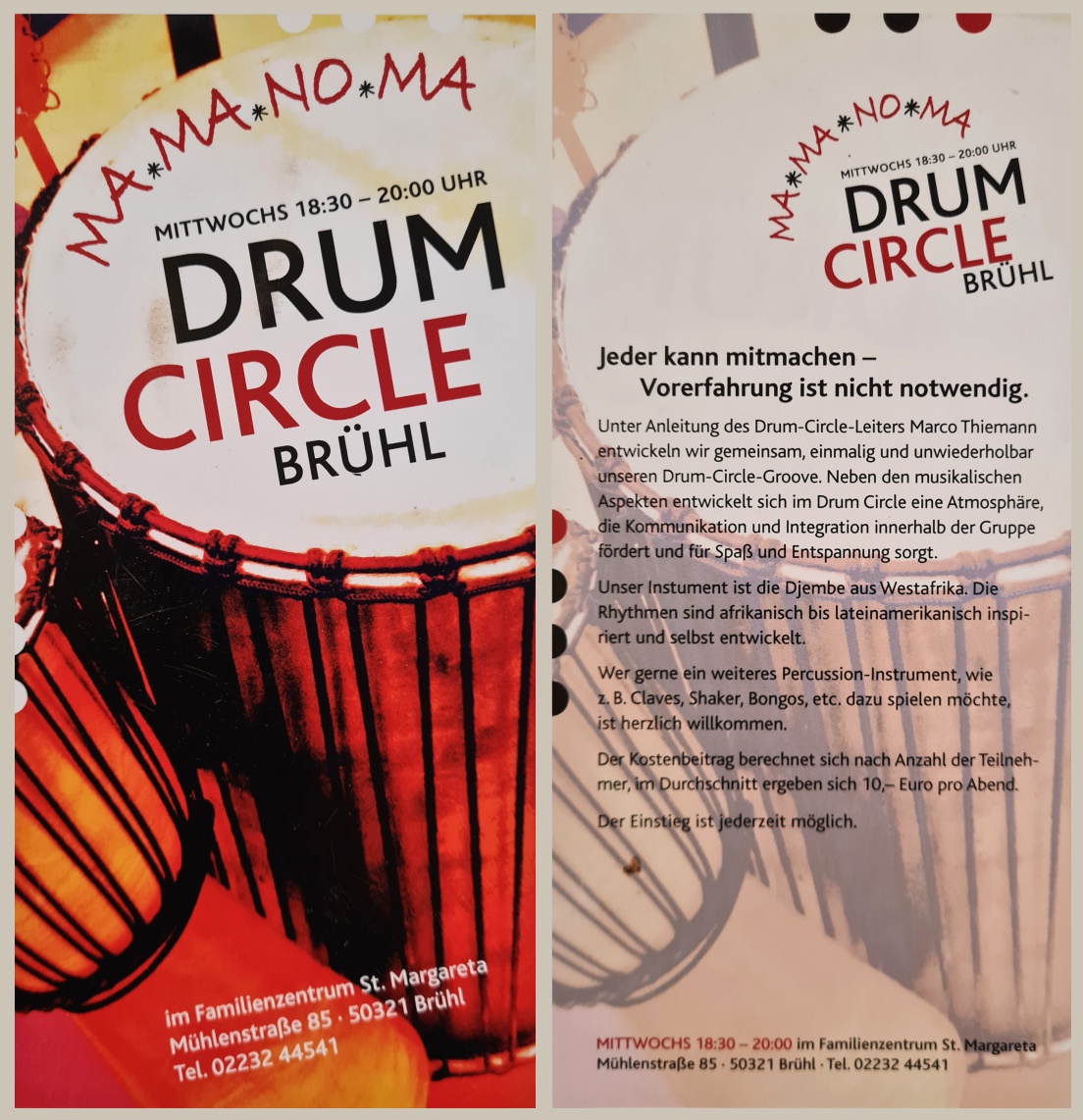 In den Sessions bewegen wir uns zwischen frei fließendem, energetischem, gemeinsamem Trommeln und polyrhythmischen, mehrstimmigen Trommel-Arrangements afrikanischer oder lateinamerikanischer Tradition (z.B. Cumbia, Kuku, Bailefunk und Samba).