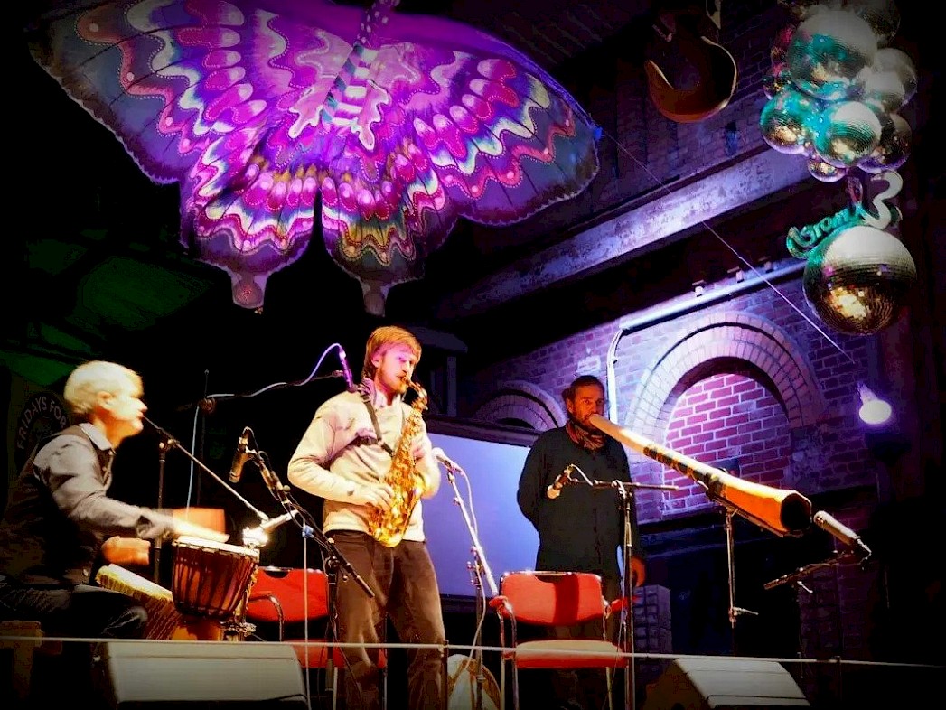 Saxophon, Posaune, Didgeridoo, Gitarre, Perkussion, elektronische Loops, Sounds & Beats geben unseren Herzensliedern den Rahmen und die Würze für eine ekstatische Party.